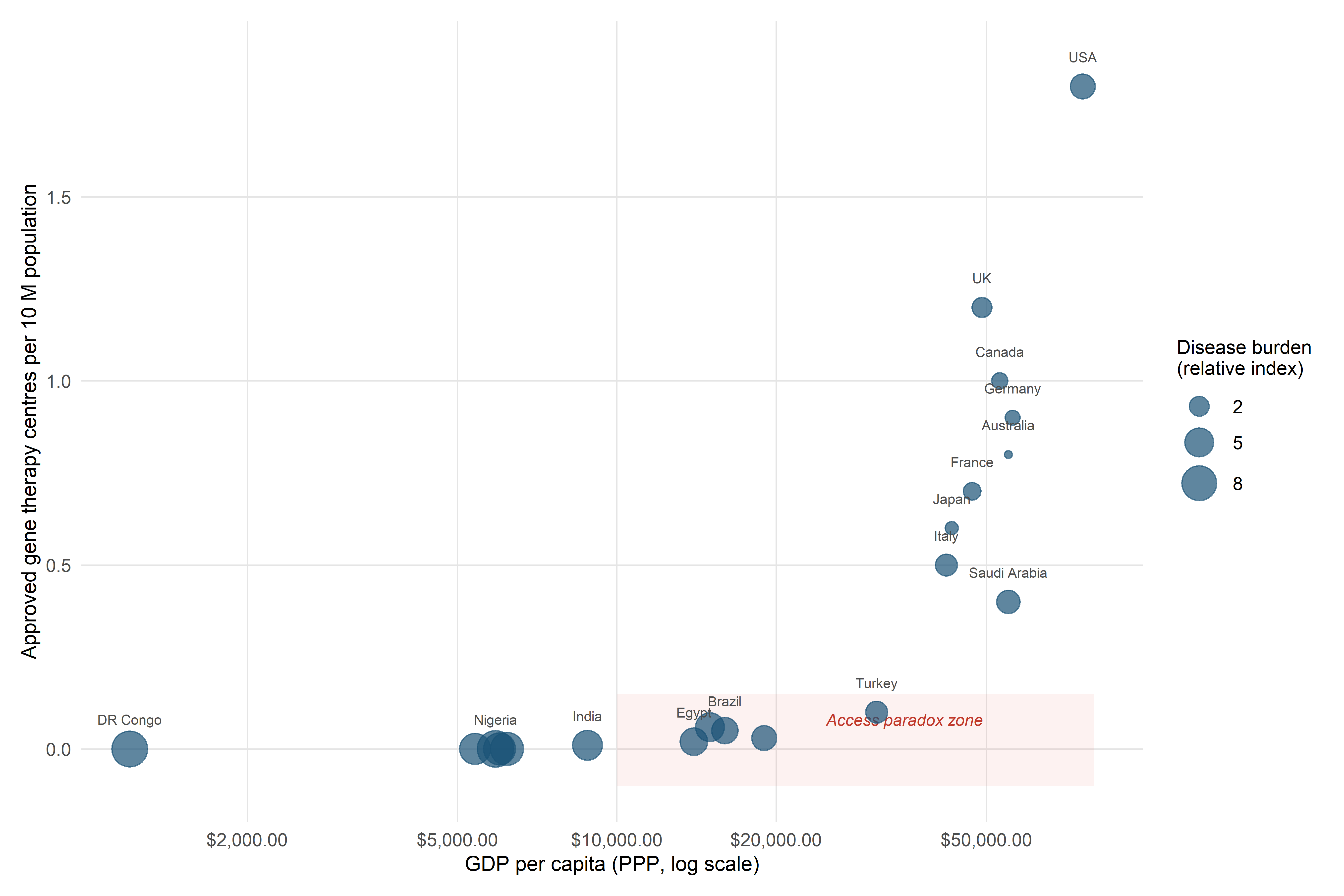 Figure 8.2: Global access landscape for approved CRISPR-based therapies (early 2026). Each point represents a country; position on the x-axis indicates GDP per capita (PPP, log scale), and position on the y-axis indicates the number of approved gene therapy treatment centres per 10 million population. Point size is proportional to estimated disease burden for the three primary CRISPR therapy indications (sickle cell disease, β-thalassaemia, Lynch-associated cancers). The lower-right quadrant—high disease burden, low treatment infrastructure—illustrates the access paradox discussed in §8.4.