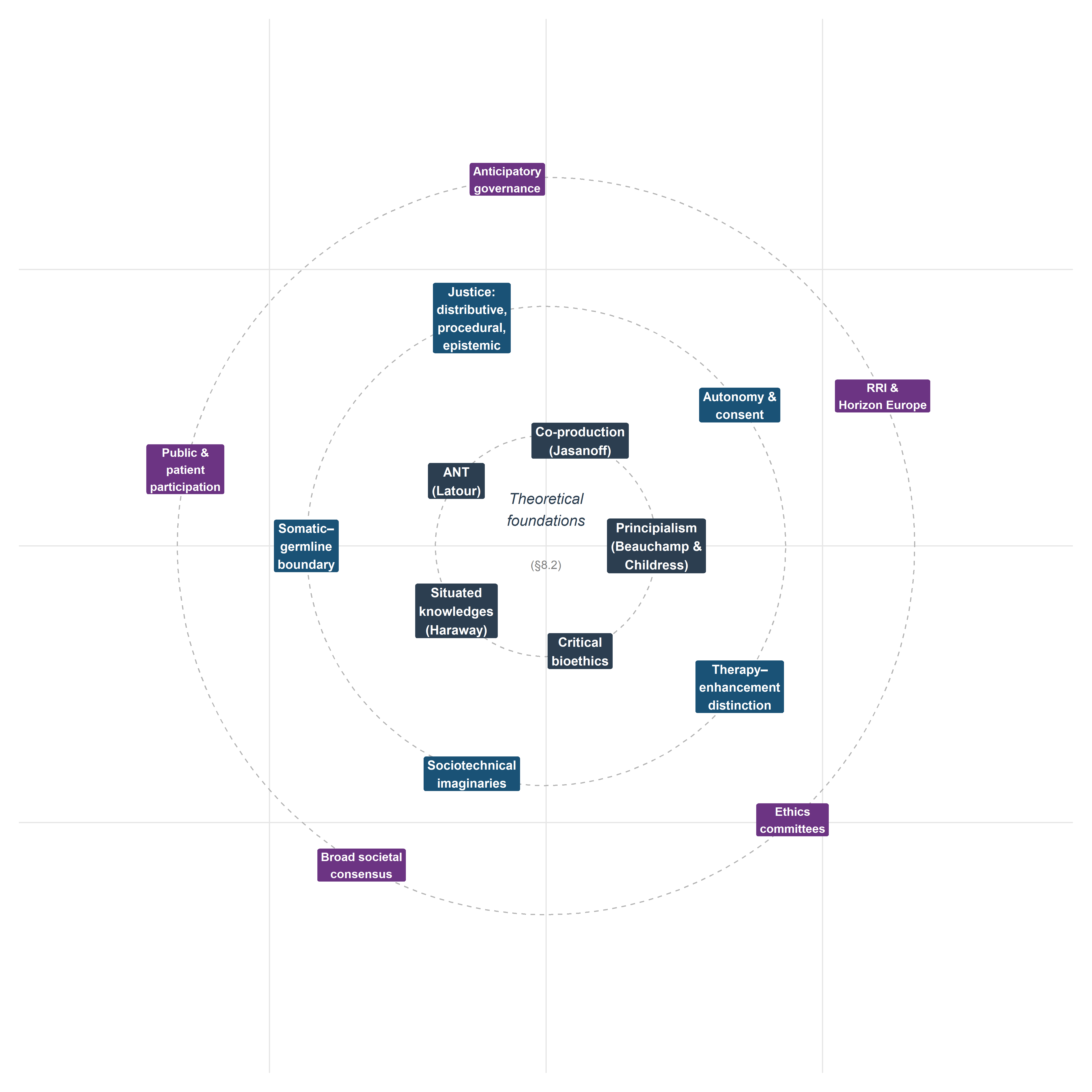 Co-productionist analysis: technical and normative claims are examined as mutually constitutive rather than independent. The somatic–germline boundary, the therapy–enhancement distinction, and the concept of ‘broad societal consensus’ are treated not as pre-given categories but as ongoing accomplishments that require maintenance, negotiation, and institutional support (§§8.5, 8.7, 8.8).